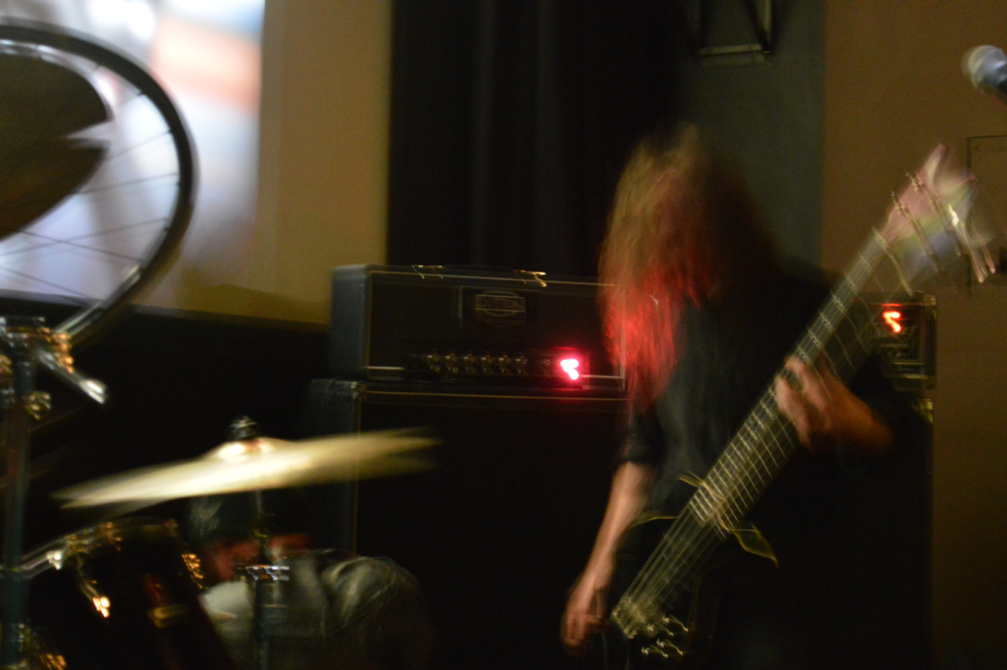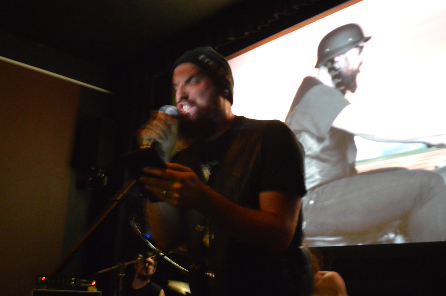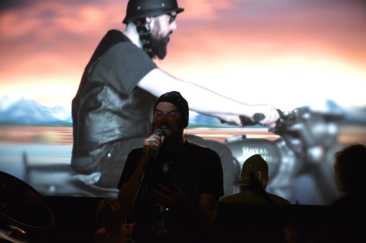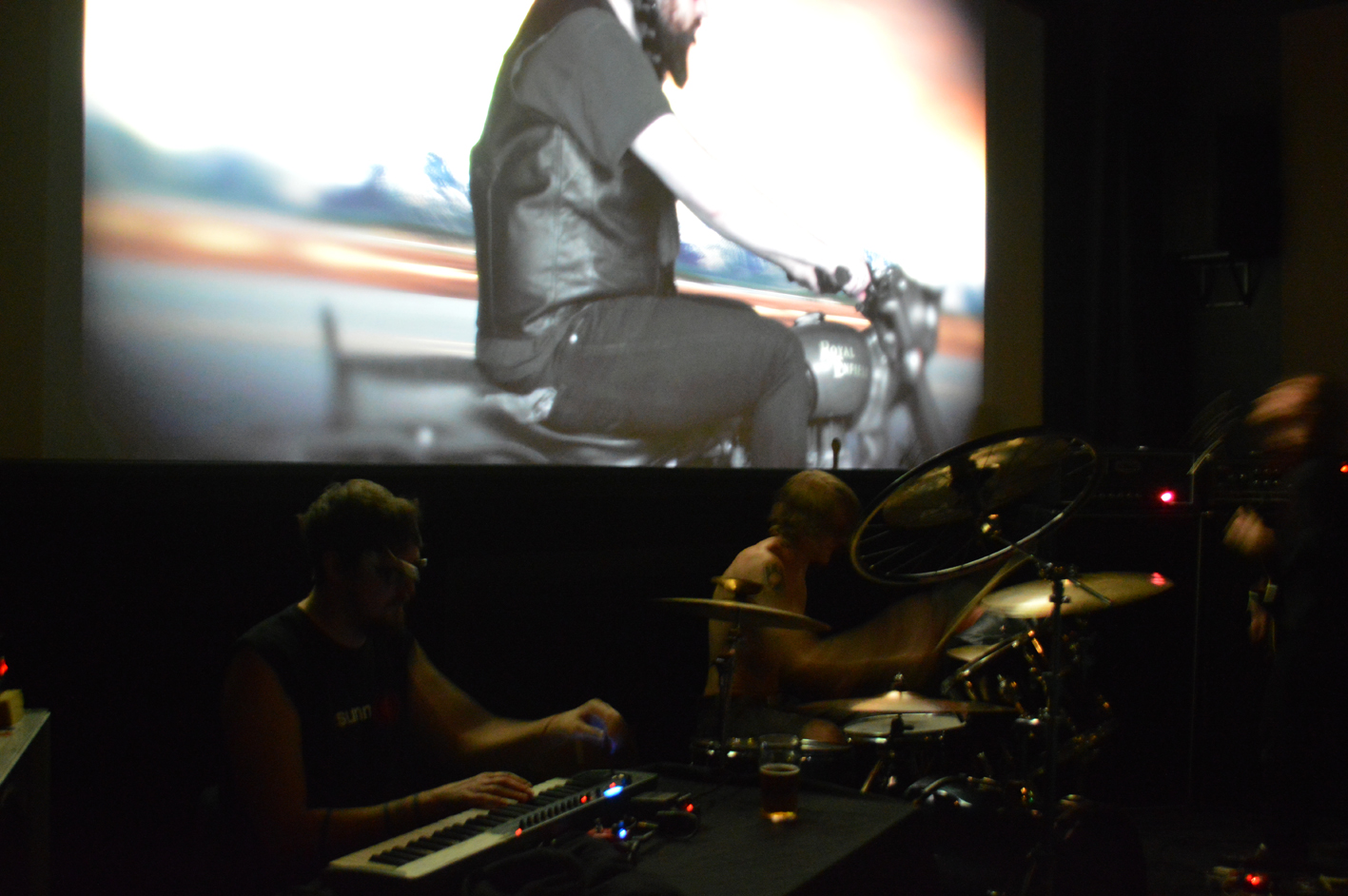 There was a tonal shift as Charlie Woolley took centre stage next, performing his piece Lone Soul Road, a meditation on biker culture, with Brixton band Ghold providing the backing. Dressed in full on biker leathers and looking for all the world like an extra from The Wild Angels, Woolley delivered a forceful performance taking in everything from Revelations, Buddhist scriptures, Medieval scrolls and fire and brimstone. Ghold sounded suitably grimy and ear-scouring in accompaniment, providing a non-stop chuntering wall of feedback. With such heaven-splitting noise you’d be forgiven for thinking the screen backdrop wasn’t showing Woolley motoring through a lonesome desert canyon but a horseman of the apocalypse itself.