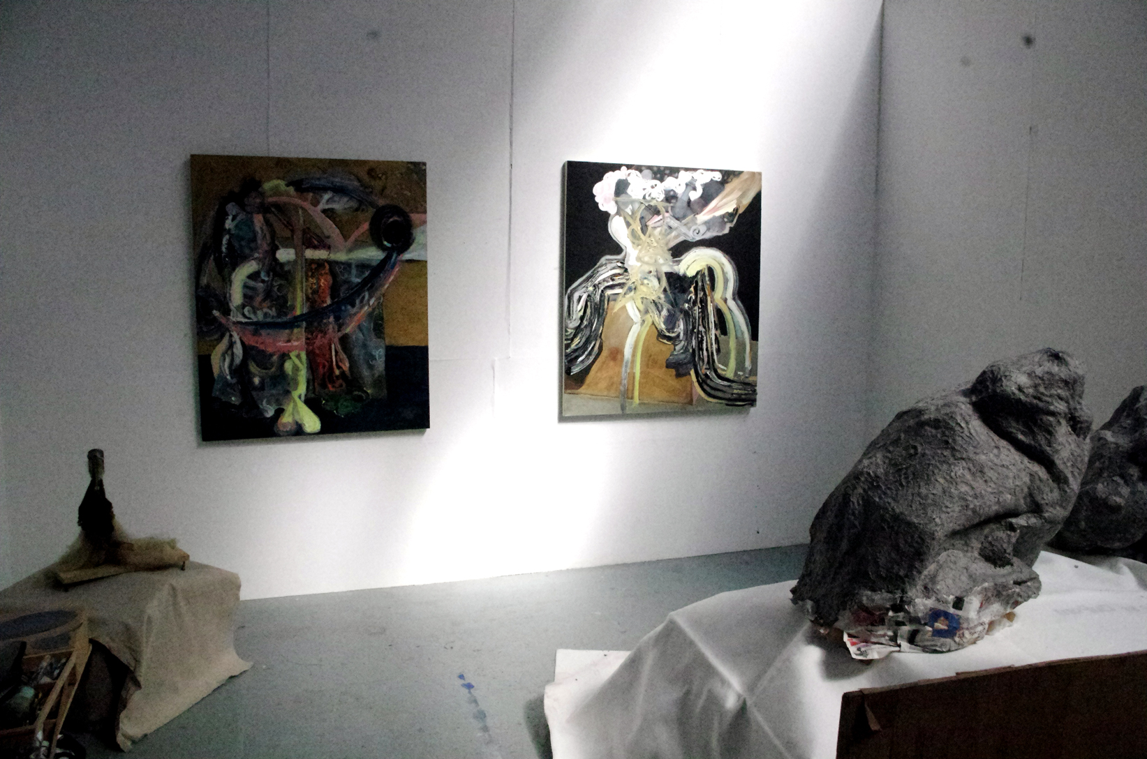 Russell and Ryan Oliver’s space was an interesting one as it was sparsely laid out. The paintings were a mix of gender anxieties and images of advertising which addressed the same issues. Ryan works with collage, questioning fashion and depictions of women. Russell’s paintings are to be viewed as commentaries upon human topics, religion and modern mythology.