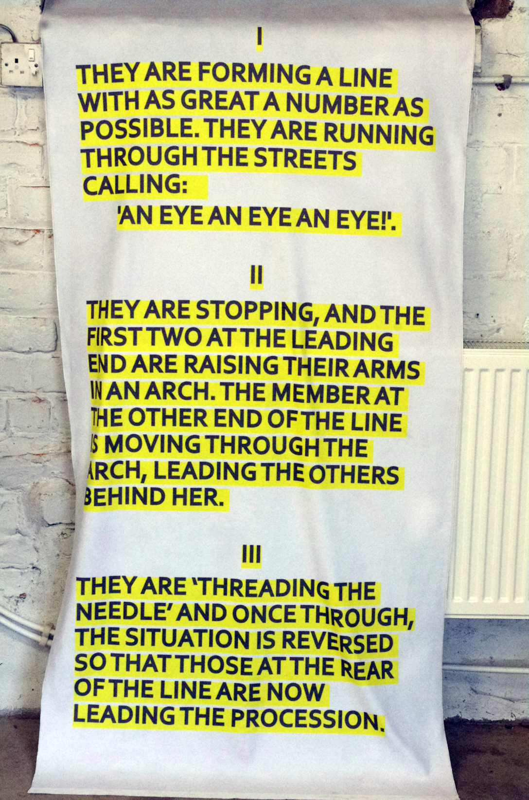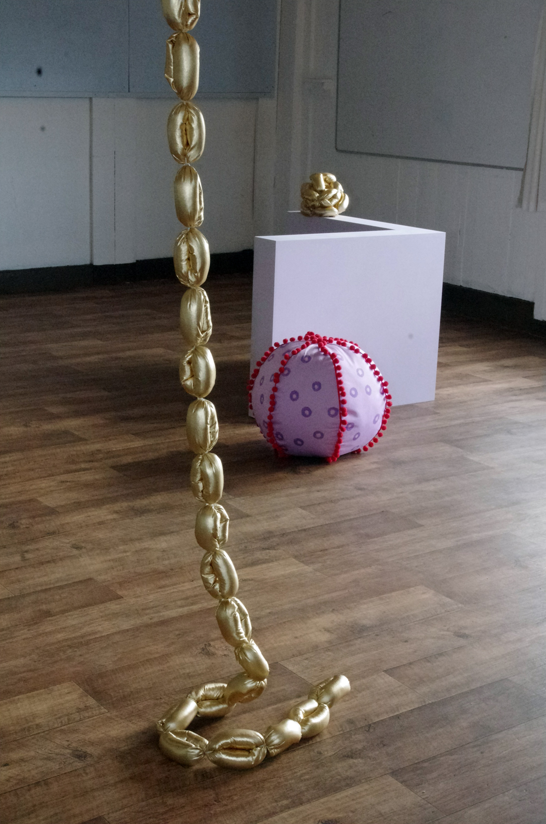 Next all the way back to the docks to see ‘Surfacing’ by Emma Ewan, Will Kendrick and Rebecca Ounstead. The space (Benjamin Perry Boathouse) had lots of potential and housed kitsch coloured objects of gold, lilac and red/magenta. The exhibition was commissioned by Hand in Glove, an organisation that creates opportunities for emerging artists. The 3D objects created by Ewan served as visual props for a performance by the artists. There were three performances ‘Welcome Warning’ by Ewan, which was performed on the cobbles outside the boathouse. Ounstead’s performance ‘Two Performers and Arranged Objects was in the main hall of the boathouse. Kendrick’s digital prints titled ‘Only Statues Remain’ is a day-glo feast with Roman aesthetics at its core. There are other elements contained in the prints, which are linear technical drawings of futuristic robots and machines.
