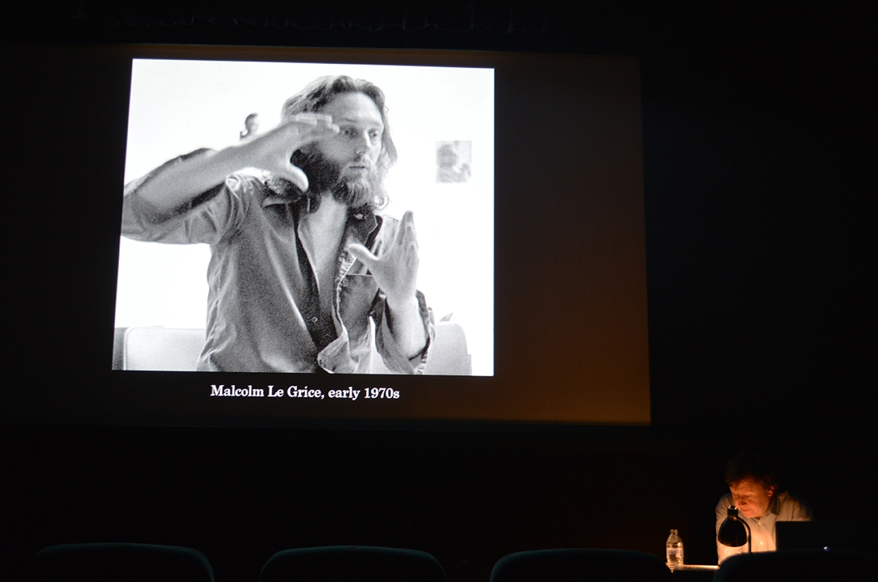 I only have a basic prior knowledge of Malcolm Le Grice’s work and independent curator, Mark Webber’s research into artist’s moving image from the last 60 years. Both led me to expect that Webber would show some of Le Grice’s 16mm film works and at least mention the London Filmmaker’s Co-op and Le Grice’s role in the development of that organisation, established 51 years ago. I anticipated that his talk would widen my understanding of the artist’s practice, highlight Le Grice’s position in the chronology of recent art history and offer a specialist interpretation of his work beyond the information available in the galleries for Present Moments and Passing Time.