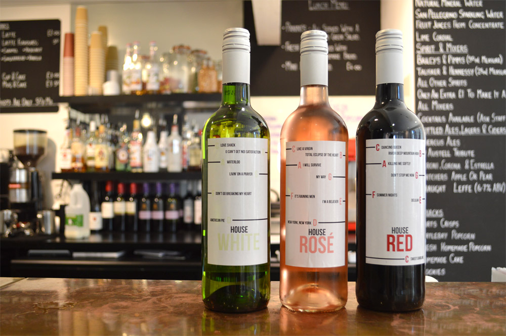 New limited edition labels on bottles of Plymouth Art Centre’s House wine have been created to act as ‘tuning forks’, positioned so that the levels of wine when tapped correspond exactly with the starting note of the top 20 most requested karaoke songs in the UK, including “Dancing Queen”.